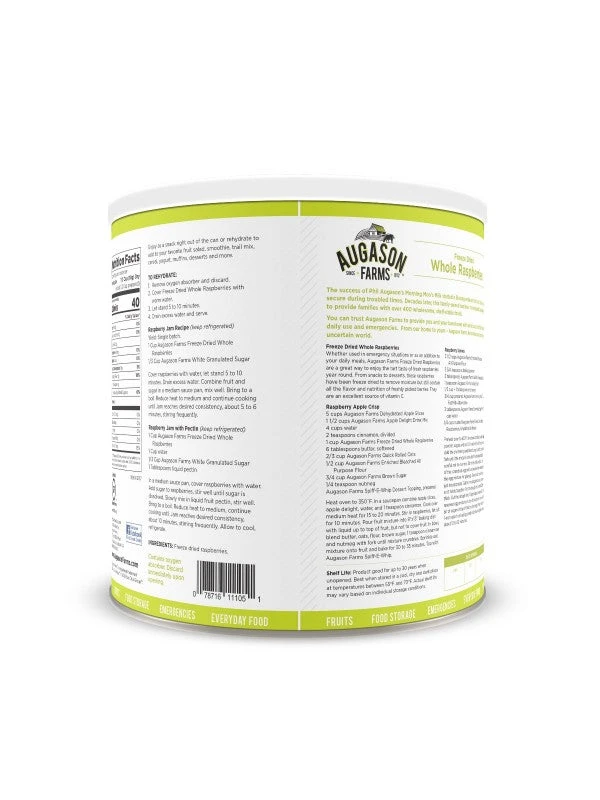 Augason Farms Freeze Dried Whole Raspberries are full of flavor, antioxidants and vitamin C. These raspberries have a fresh, perfectly tart taste great for snacks or use in your emergency food supply. You can add this freeze dried fruit to your favorite breakfast meals or add them to desserts like raspberry white chocolate cookies or raspberry dusted fudge.
