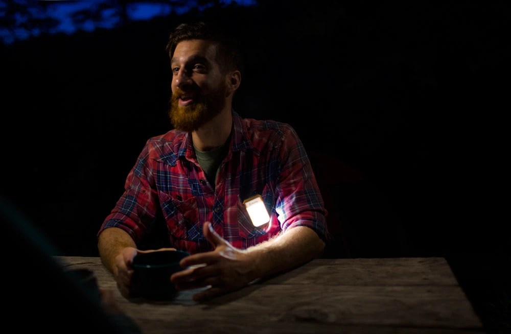 Hang, stand, or wear, this little light can do it all: featuring an integrated clip and flat- pack edge-lit technology, this mini lantern can slip into any pocket for on-the-go light and power. Whether its lighting your bed- side table, flashing as a tail-light clipped on your pack, or powering up your phone in a pinch, the TraveLight belongs in every bag.