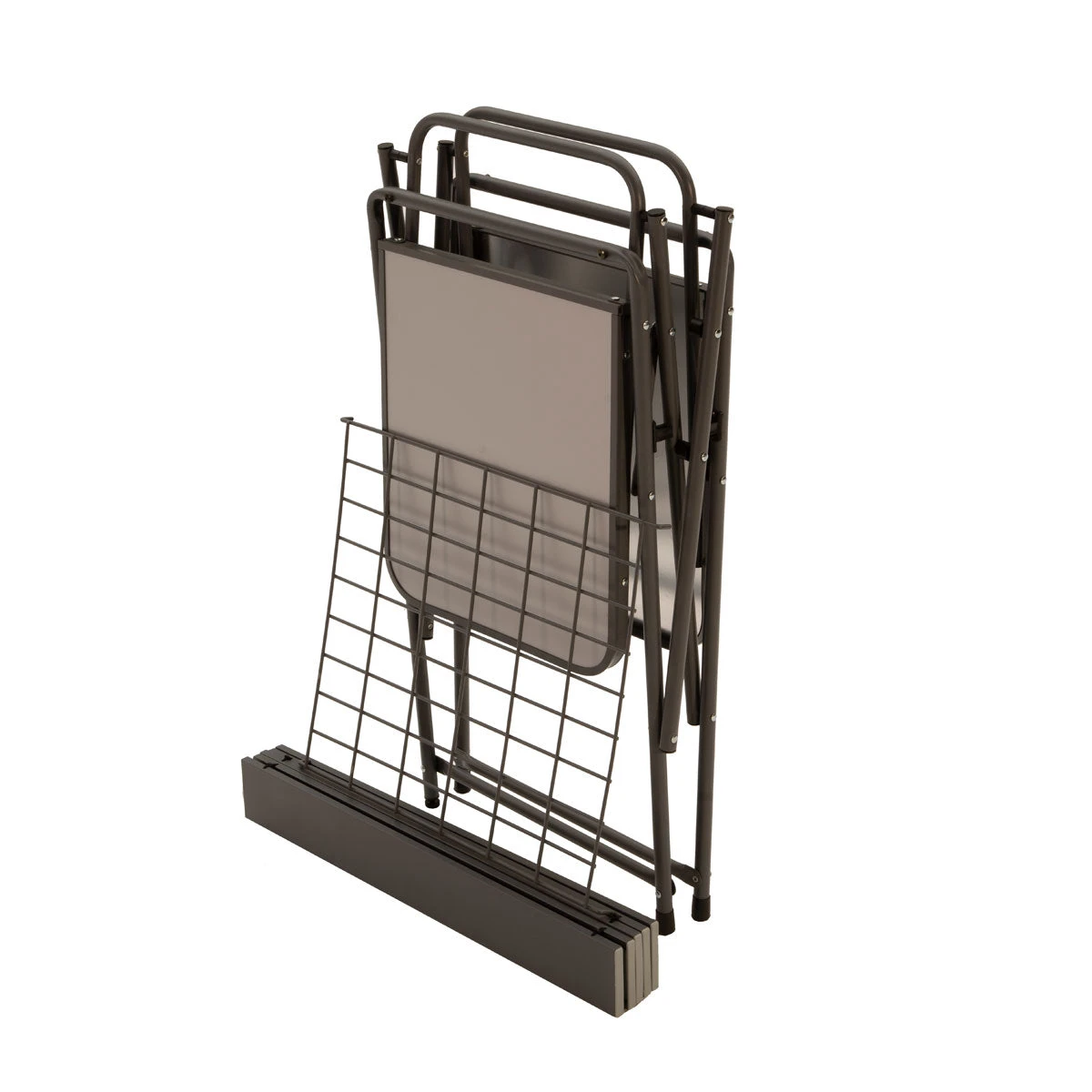 - Place your camp stove on the main platform and foods and accessories on the two side platforms.