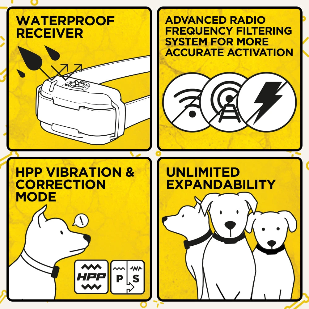 Our water-resistant transmitter is designed with a Field Width adjustment knob to increase or decrease the width of signal to adjust the area where the receiver first activates from the wire, depending on your property layout and size. The transmitter includes two correction modes: High Performance Pager vibration warning before stimulation and a High Performance Pager vibration only mode.