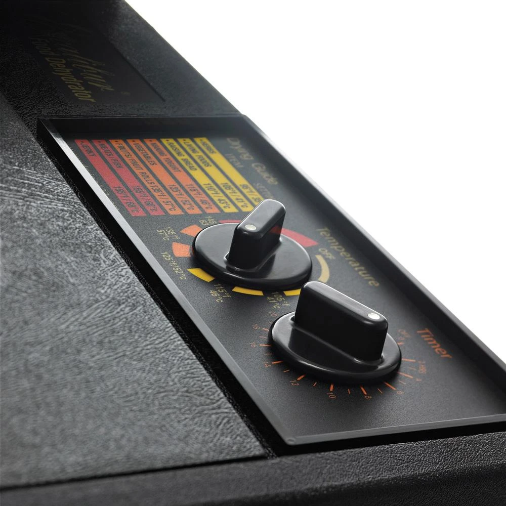 9 plastic trays with BPA-free mesh screens, 15 square feet of drying space, 26-hour timer, clear door for easy viewing of drying progress, adjustable thermostat range of 105 F to 165 F, 7″ fan for excellent air circulation. Easy to use. Includes Guide to Dehydration so you can learn how to dehydrate all types of foods.