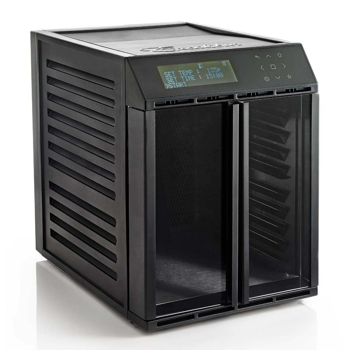 The Excalibur Model RES10, 10-tray, 99 Hour 59 Min Timer Dehydrator with smart digital controls. A clear, double door opening lets you view progress without interrupting the drying process. The Model RES10 comes complete with a total of 9.3 sq ft (8169 cm2)of drying space, 131.00 CFM airflow with two independent fans, two independent adjustable thermostats 85 F – 165 F (29.4 C – 73.9 C), Hyperwave Patented Technology, and Parallex Horizontal Air Flow. Dehydrate using zone A, zone B, or both zones A and B. Each zone can be set for 1 or 2-time durations and 1 or 2 temperature settings for variable food drying needs and to speed up the drying process. Option to program and save 30 of your favourite recipes.