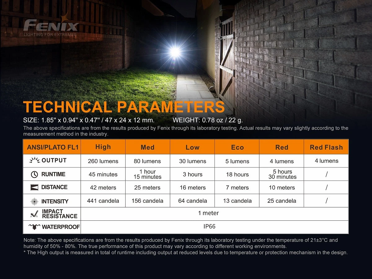 | OUTPUT | 260 Lumens | 80 Lumens | 30 Lumens | 5 Lumens | 4 Lumens | 4 Lumens |