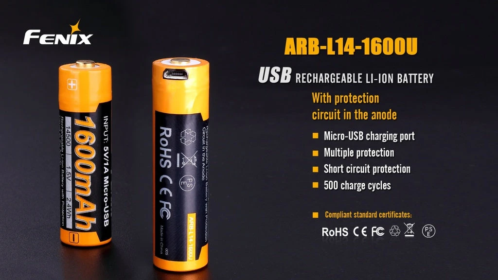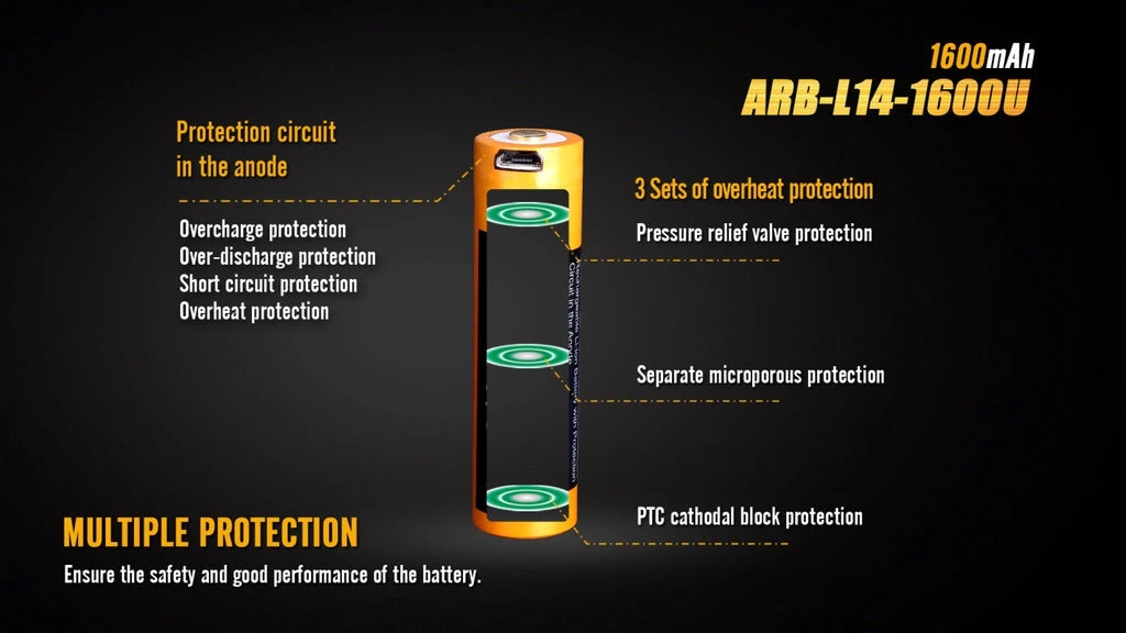 The ARB-L14-1600U 1.5V battery can be charged by its own USB port only. A protective circuit is built into the anode and covered with a riveted steel hat. The battery is fully covered with the steel shell, thus the potential risk of short circuiting caused by collision or impact is hugely eliminated.