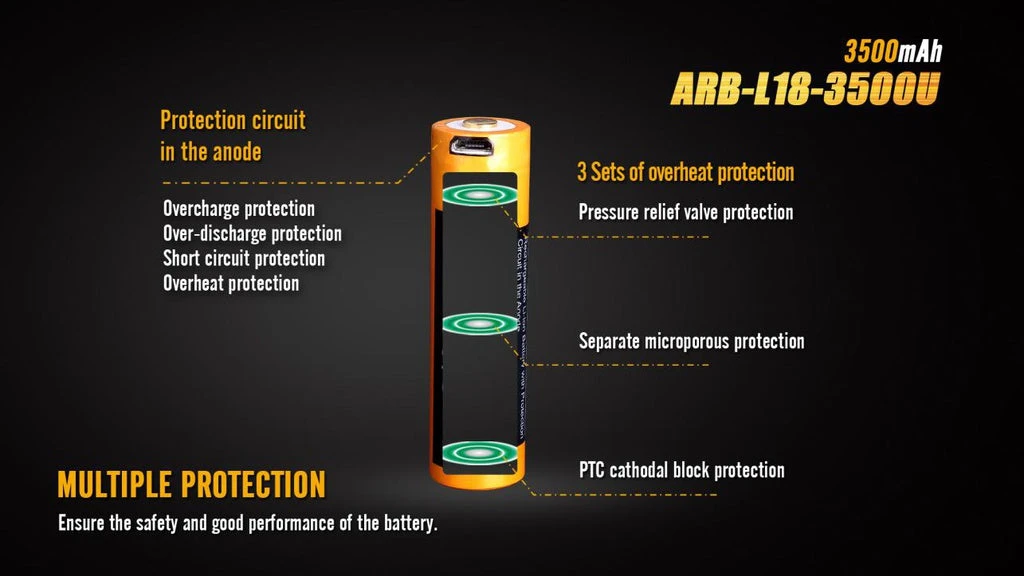 Fenix ARB-L18-3500U is a high capacity 18650 Li-ion rechargeable battery with a built-in micro-USB charging port. It also includes a protection circuit in the anode to help prevent short circuits, over charge/discharge and over heating. This battery can quickly be charged without the need for a separate charger, need to mention an external charger will charge the battery faster and more convenient in most situations. This batter will work in all of the models that utilize the standard Li-ion 18650.