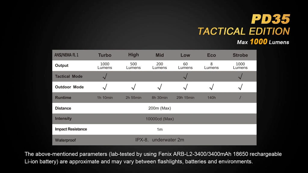 Designed with the military and law enforcement professionals in mind, this flashlight is measured at less than 14cm (5.5 inches) long and features up to 1000 lumens in turbo output while throwing it’s beam a distance up to 200 meters. In Outdoor Mode, the PD35 TAC delivers six output modes including a variable strobe. Switch to the new Tactical Mode to activate rear-switch only operation for fast, simplified mode selection of momentary, turbo, low and strobe. The PD35TAC is powered by two CR123A or single rechargeable 18650 batteries (not included)