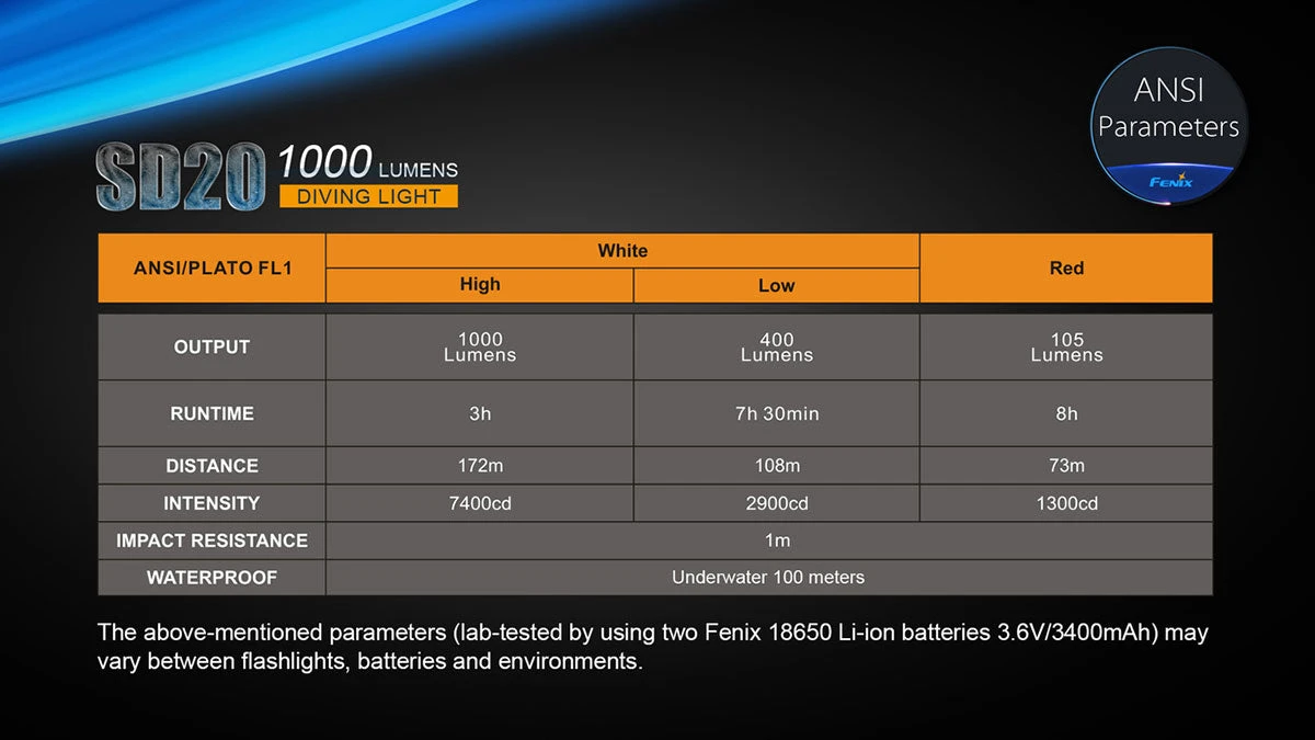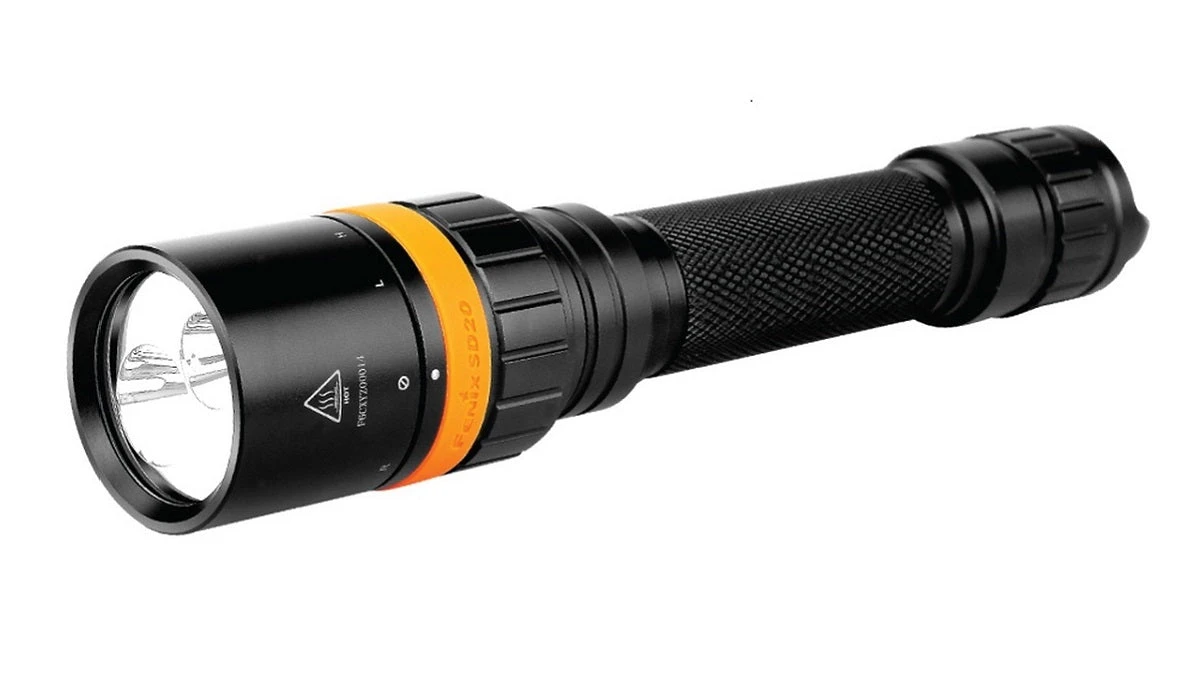 Whether deep-sea exploration, hunting or observing underwater nightlife, the Fenix SD20 flashlight is built for all diving activities. Delivering a maximum output of 1000 lumens of white light and 105 lumens of red light, the SD20 is powered by two 18650 rechargeable batteries. With a twist of the flashlight head, users can access three lighting modes and turn the light on and off. Equipped with a rotating magnetic ring for one-hand operation and a battery indicator light, this light offers convenience and assured illumination to those under water or on dry land.