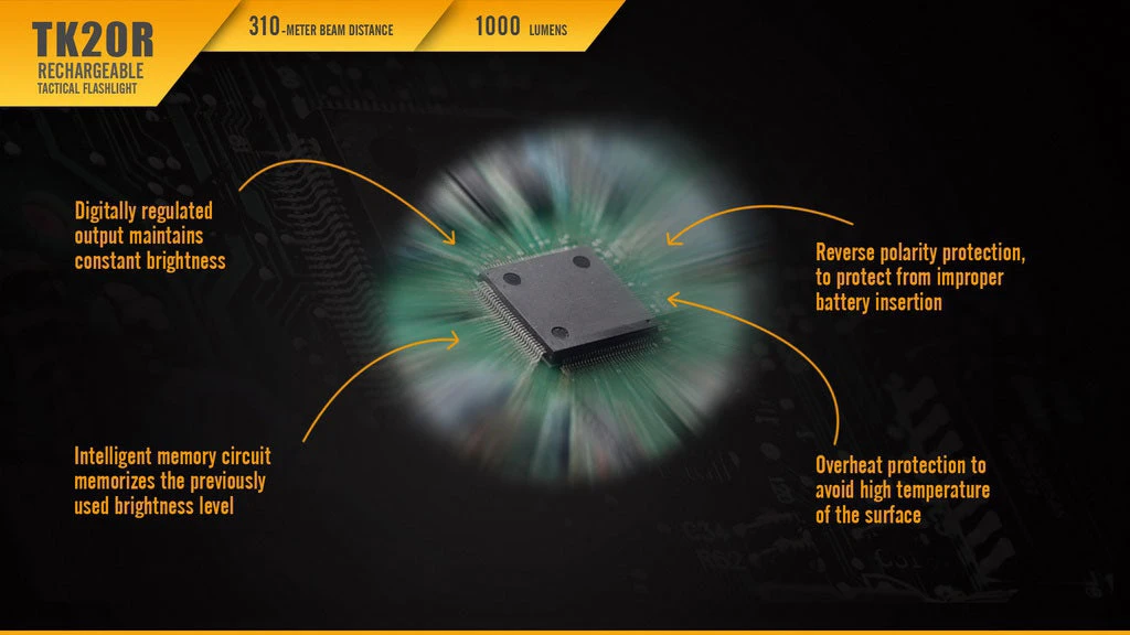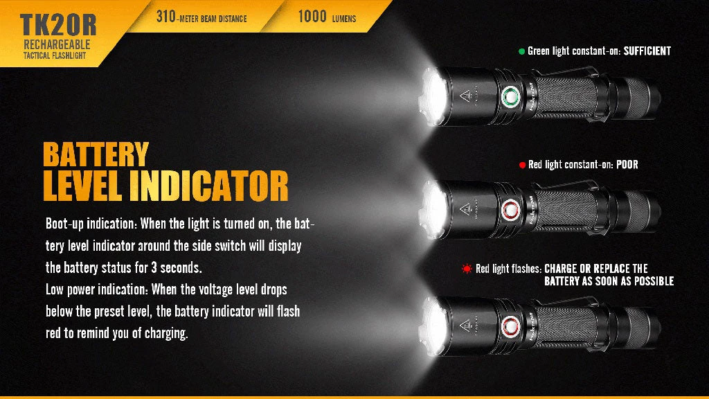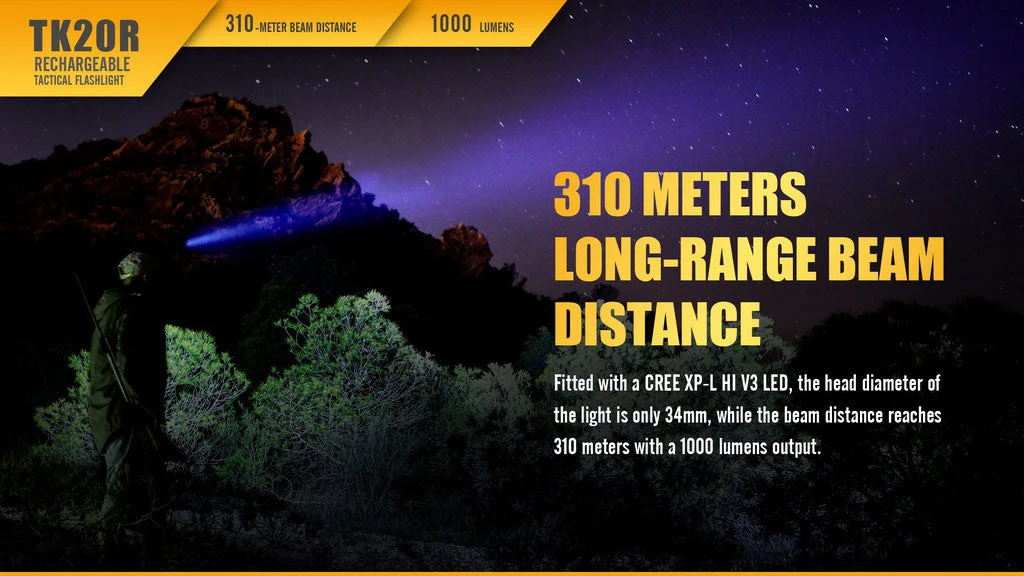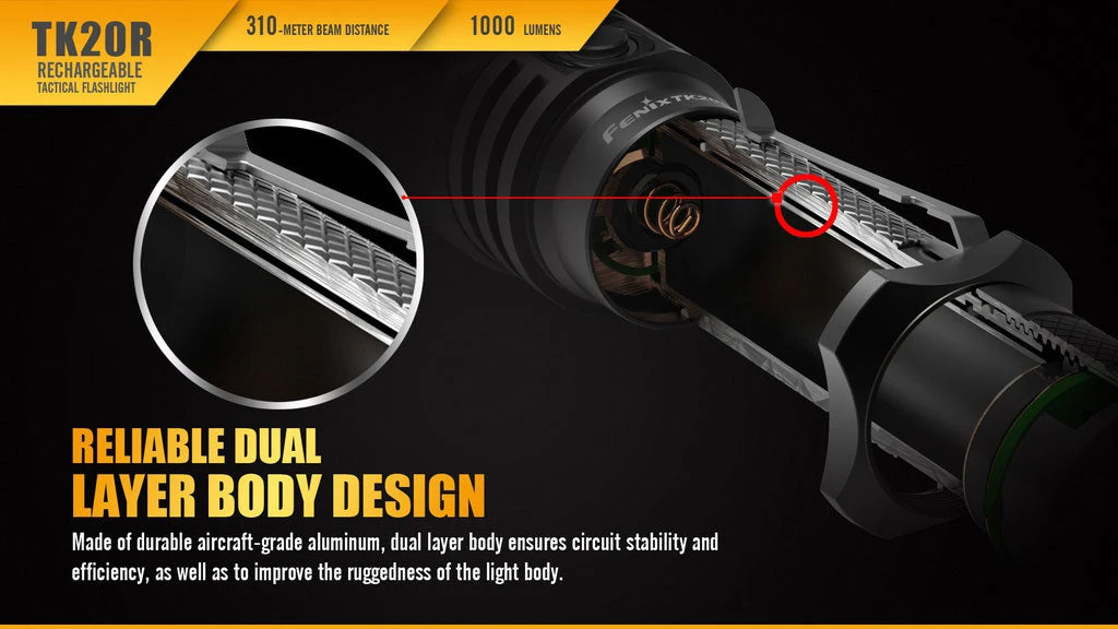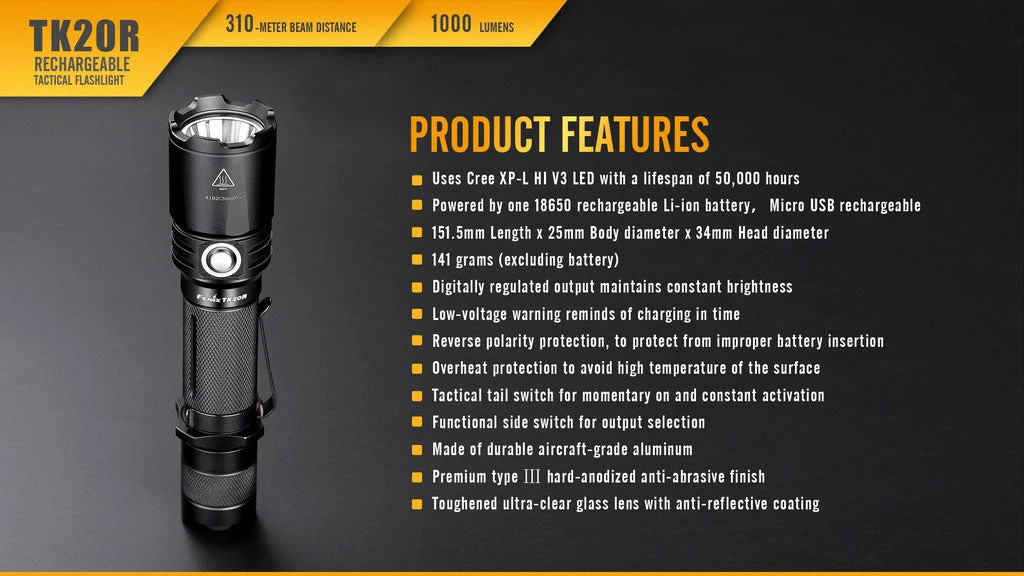 Fenix TK20R is a Micro-USB rechargeable flashlight that is designed for tactical applications. It delivers a maximum beam distance of 310 meters by utilizing a CREE XPL HI V3 LED, and has a max output of 1000 lumens. In addition, it is powered by one 18650 rechargeable Li-ion battery, and two cold resistant CR123A can be used as standby batteries. Features are dual layer body, inner waterproofing treatment; and a tactical tail switch and side switch that allow easily access to four output levels and strobe. This compact but hardy flashlight is ideal for tactical application, industrial tasks and hunting.