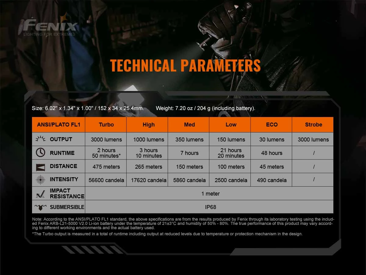 - Turbo: 3000 Lumens / 2.8 hrs / 475m