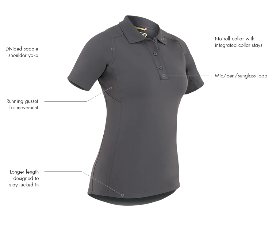 This versatile short sleeve polo with its superior fabric, features, and specialized fit is the go to shirt for active female professionals. First Tactical’s Performance Polo works as hard as you do.