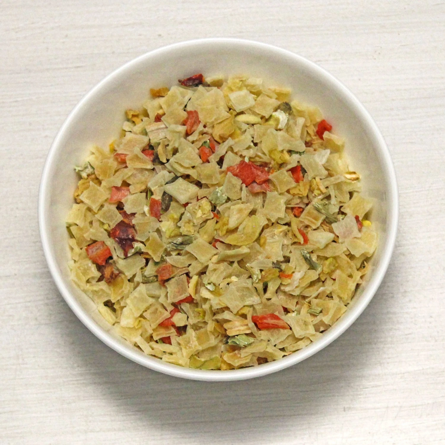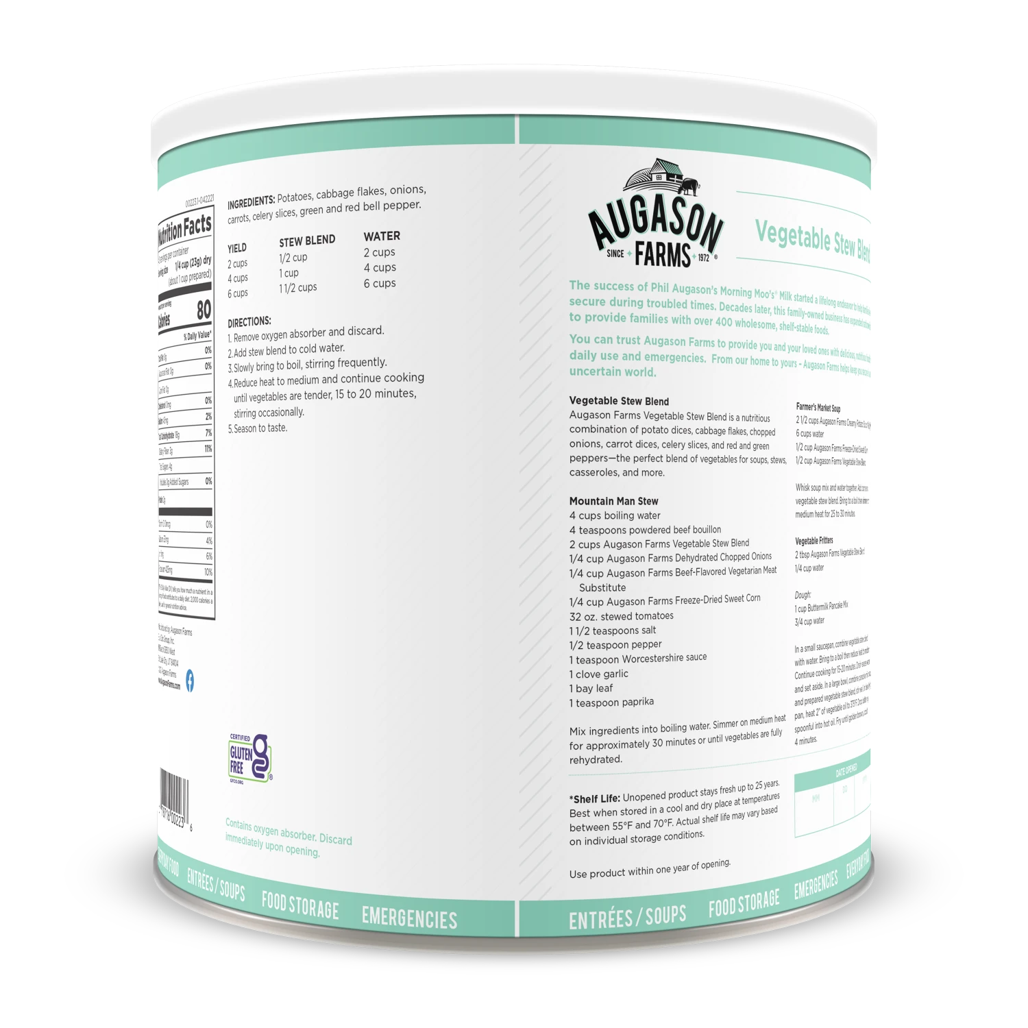 This blend is perfect for getting a variety of healthy vegetables into your diet. Potato dices, chopped onions, carrot dices and cabbage flakes are only some of the wonderful ingredients found in our Vegetable Stew Blend. Just add the indicated amount of water and reconstitute these tasty ingredients. Add them to your favorite soups, stews and casseroles.