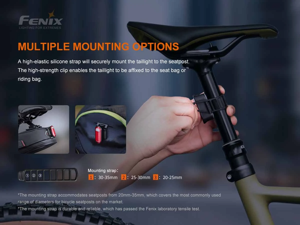 The Fenix BC05R V2.0 is an ultra-compact rechargeable bicycle tail light with an eye-catching red light built for cycling commuters and mountain bikers. Being seen from a distance in traffic with 15-lumen red light and 180 degree lighting angle will help make your bicycle commute much safer and will provide peace of mind. Quickly charge the BC05R V2.0 via the USB Type-C interface, the built-in 400mAh Li-polymer battery delivers a max runtime of 120 hours. With the included body clip, the versatile tail light can be used as a headlamp, chest lamp or backpack light.