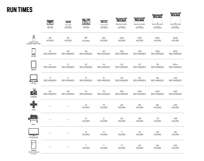 Run all your essential devices with the Yeti 1000X. Our most versatile sized power station is big enough to power larger devices such as fridges or TV’s and portable enough to pack in the car and go with you anywhere. Powers phones, laptops, cameras, fridges, grills, TV’s, and more.