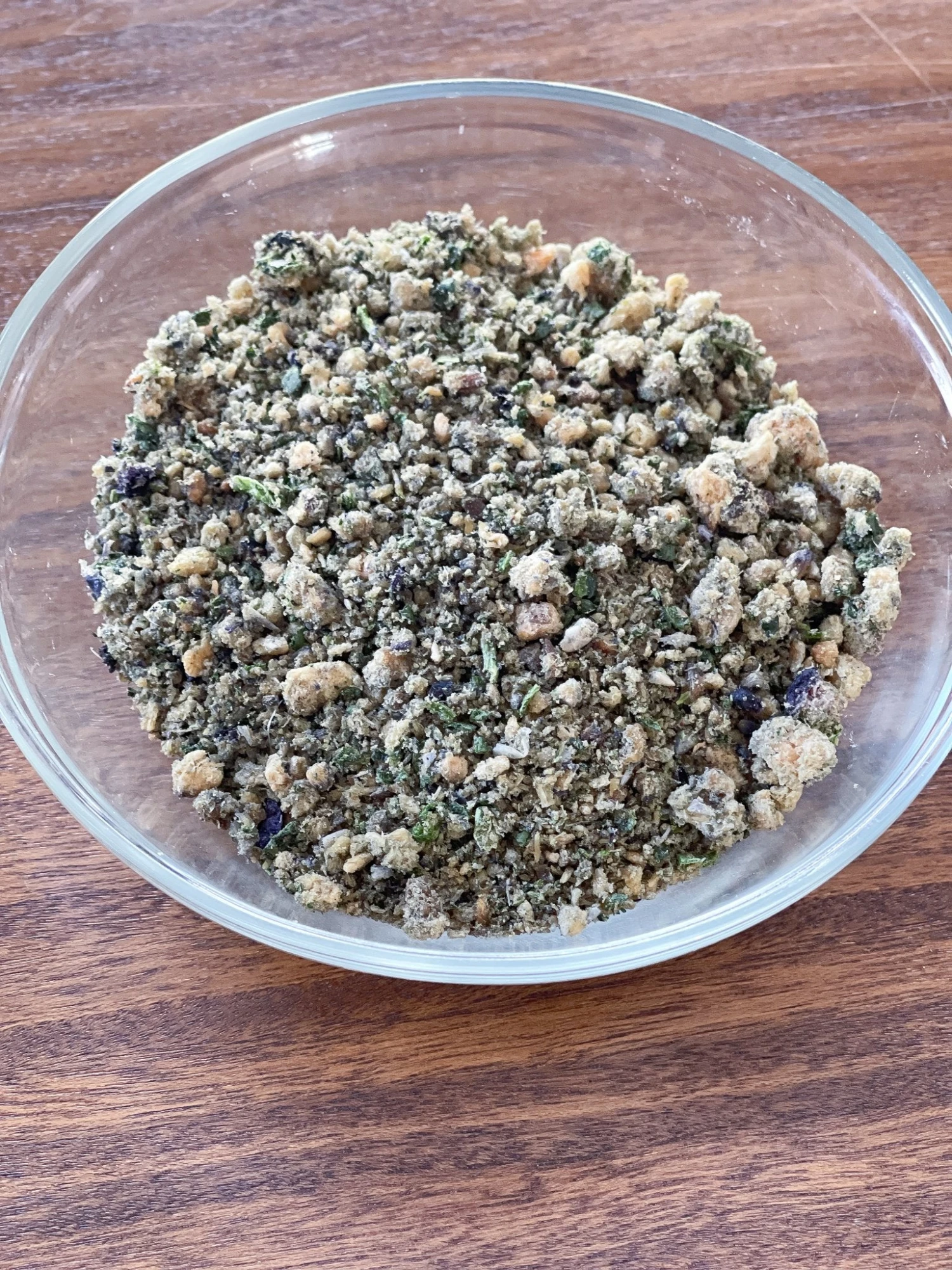 Ingredients: Whole Wild Caught Salmon, Whole Wild Caught Sardines, Spinach, Blueberries, Chia Seeds, Dandelion. For food allergy purposes the seafood only has wild caught salmon and wild caught large sardines in it. No other seafood and zero shellfish.