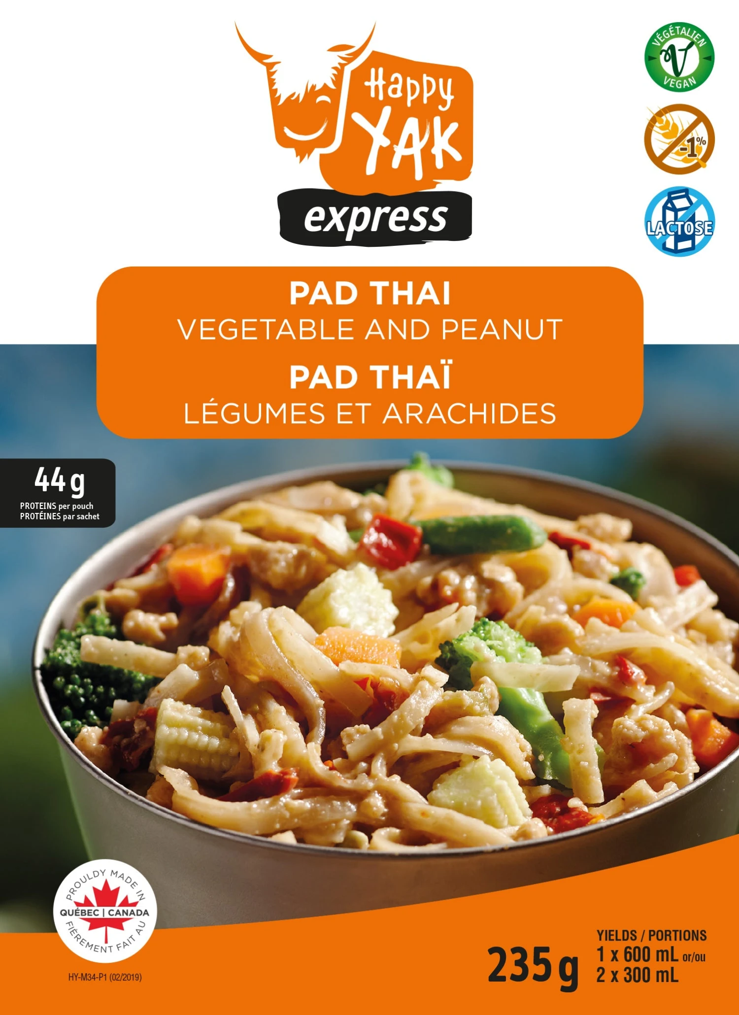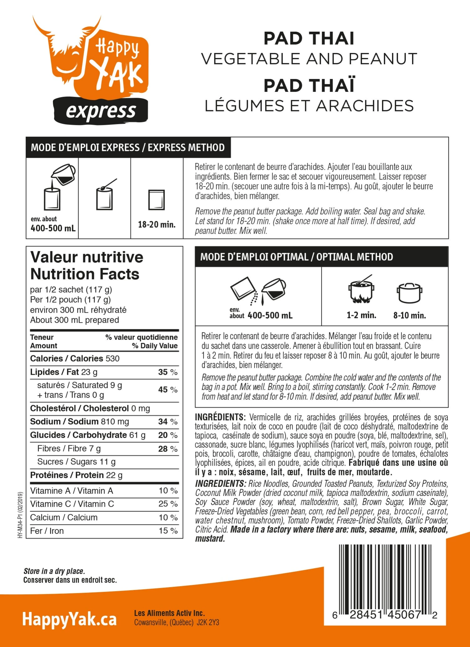 Looking for a restaurant quality Pad Thai on the go? Happy Yak has formulated a delicious express Pad Thai that is vegan, lactose-free that is less than 1% gluten. This large portion will impress you with its 44 g protein and 1060 calories.