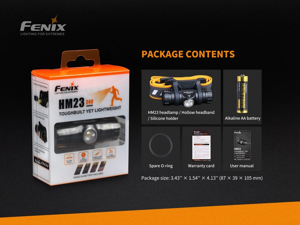 The Fenix HM23 is a compact and lightweight headlamp that operates on a single AA battery. Weighing in at only 43 grams it is great for running, hiking, climbing and other high movement activities. Made of high-strength aluminum the all-metal housing body offers great heat dissipation and durability. Soft neutral white light, featuring a max output of 240 lumens with better colour rendering for a clean, balanced beam pattern. Easy to find and inexpensive AA battery make the HM23 a great companion for your lighting needs.