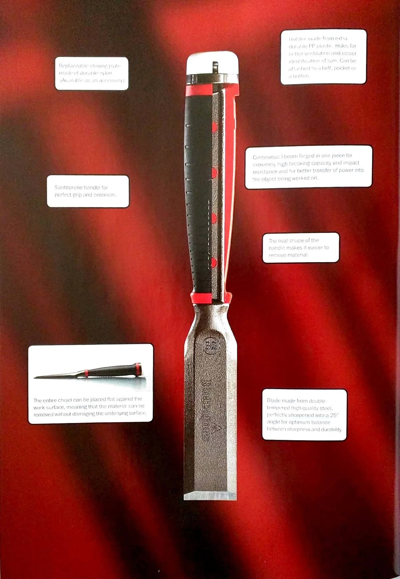 Chisels with perfect precision, sharp, heavy duty, and always close at hand. They are ready for tasks requiring extreme strength and precision. A perfect ground blade, bevelled at 25 degrees for the best ratio possible between sharpness and durability. The entire chisel including the handle can be positioned flat against the surface for expanded uses. Smart holster made from durable PP plastic for increased accessibility, the holster can easily be attached to a belt or on a button.