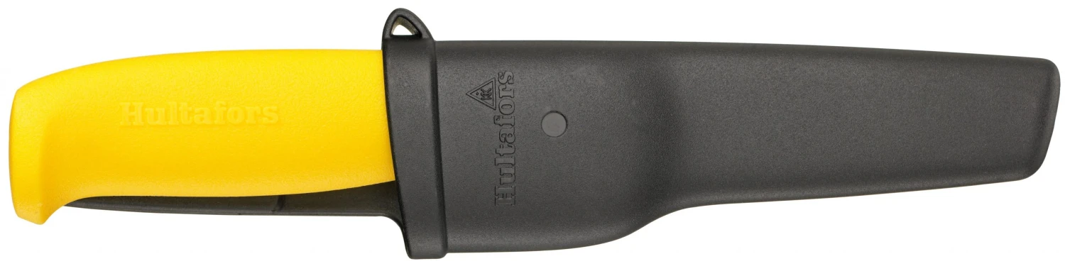 A knife designed with a dull point, developed and adapted to minimise sticking injuries. It features a unique function for attaching the holster around a button on your work clothes so that it does not come loose, whilst still being easy to remove. The blade is made from Japanese knife steel—2.5mm carbon steel that has been hardened to 58-60 HRC.