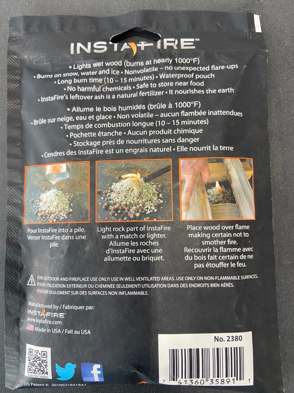 Why do I need Insta-Fire? If you ever light a fire, need a fire, cook with fire, then you need Insta-Fire. Insta-Fire was designed as an emergency fire starter. If you are back packing, hiking camping, fishing, hunting, survival, snowmobiling, snow shoeing, skiing, mountain climbing, four wheeling, any thing to do with the outdoors, you will need Insta-fire, at least once in your journey.