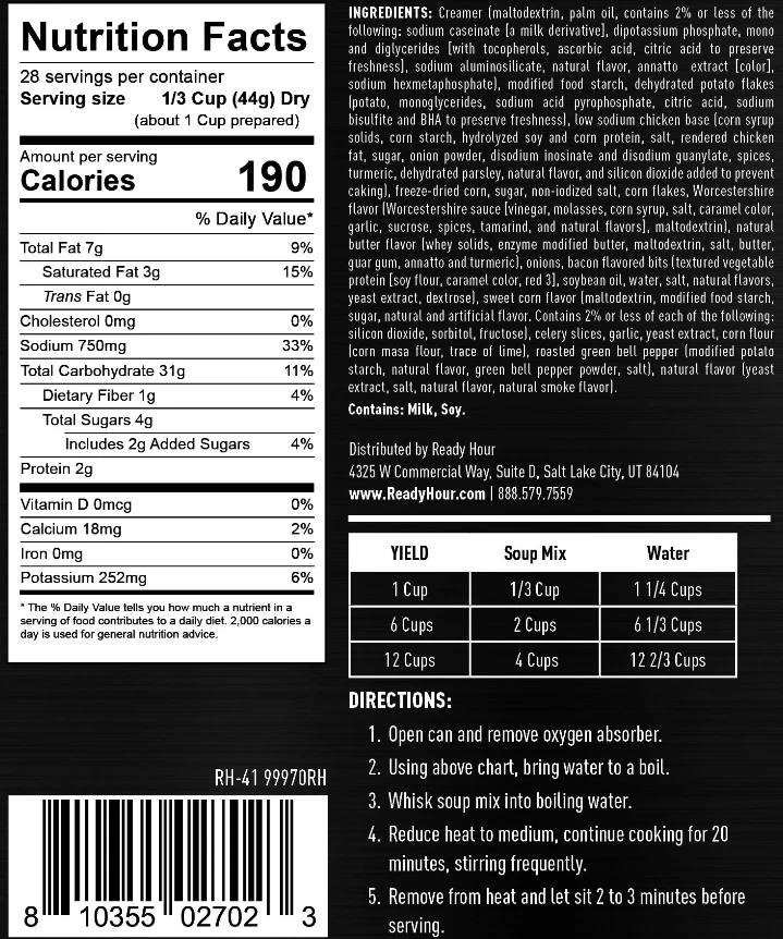 Ready Hour Corn Chowder is an old recipe and a comfort food your family will love. Made with real corn and potatoes, it is definitely going to fill you up. You can eat it on its own and get all the nutrients you need for the day or have it as an appetizer if you have a huge appetite.  No need to simmer for hours with our products. We made our soups easy to prepare with a long term shelf life for potential emergencies.
