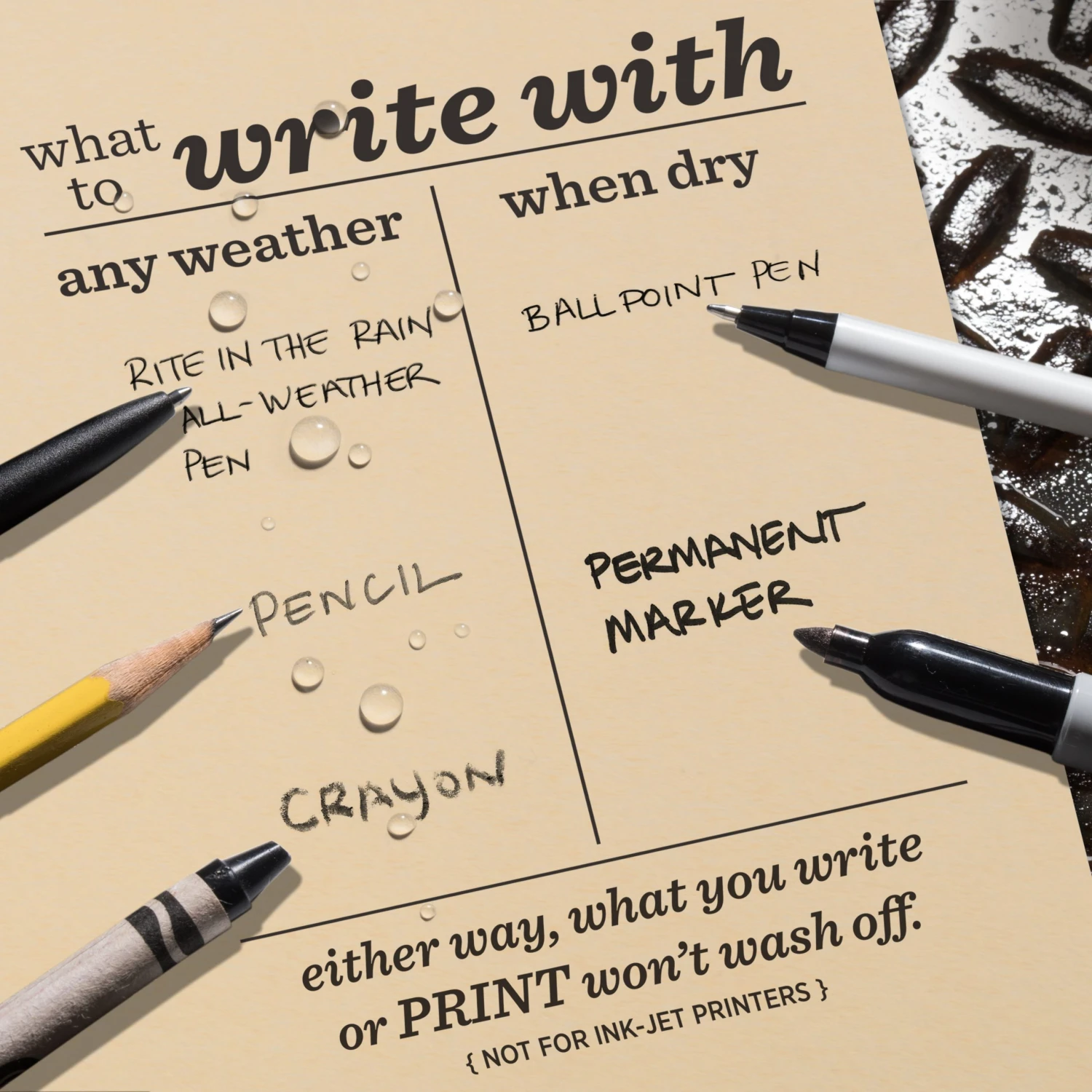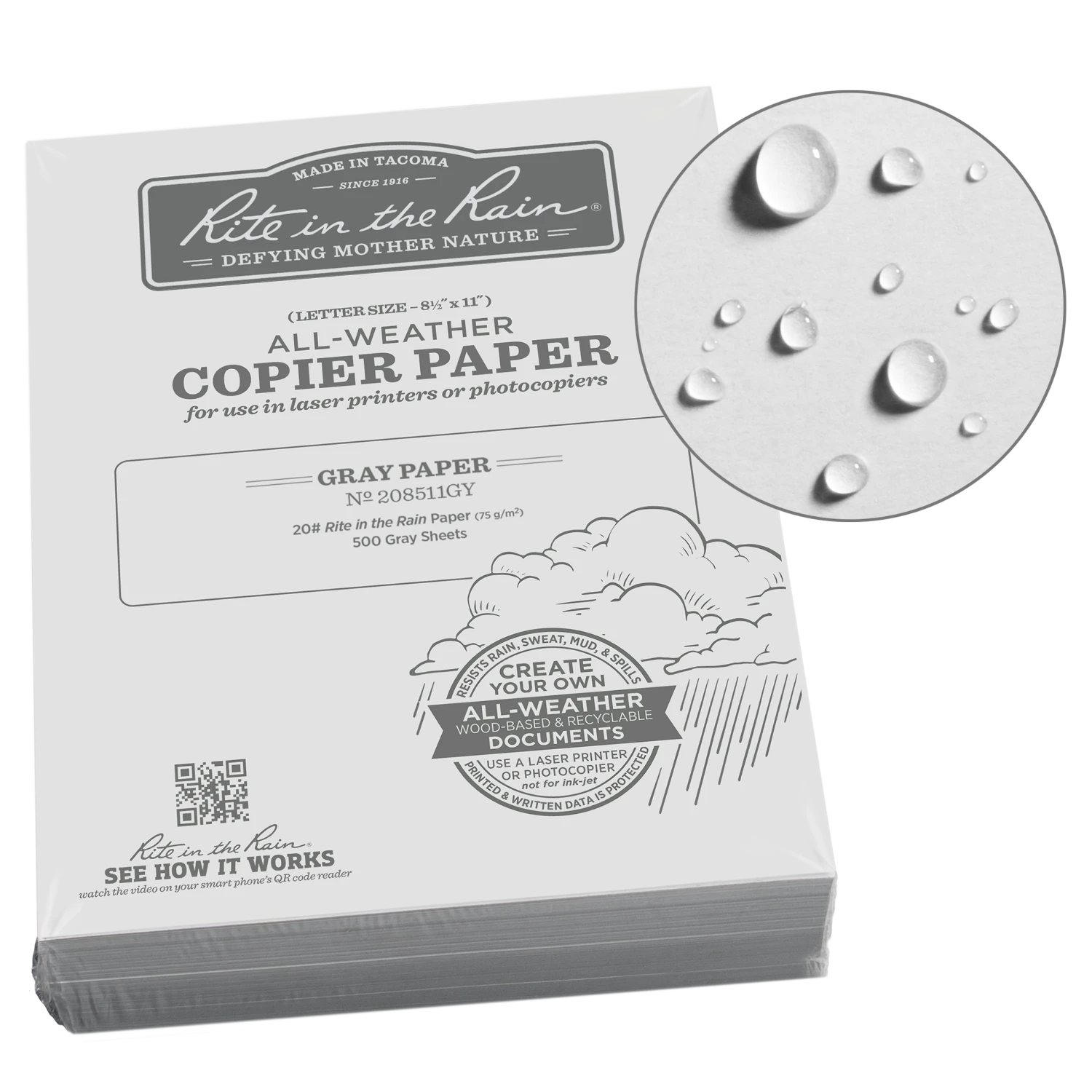 Copy or laser print your own all-weather forms, charts, maps, and worksheets on patented Rite in the Rain All-Weather Copier Paper. Have the convenience of using your existing data sheets on a paper that can survive in any weather condition. For pennies a sheet, Rite in the Rain enables you to work efficiently, regardless of the environment. Paper is 20# bond weight. Completely recyclable wood-based paper. Copy or laser print both sides. Not for inkjet printers.