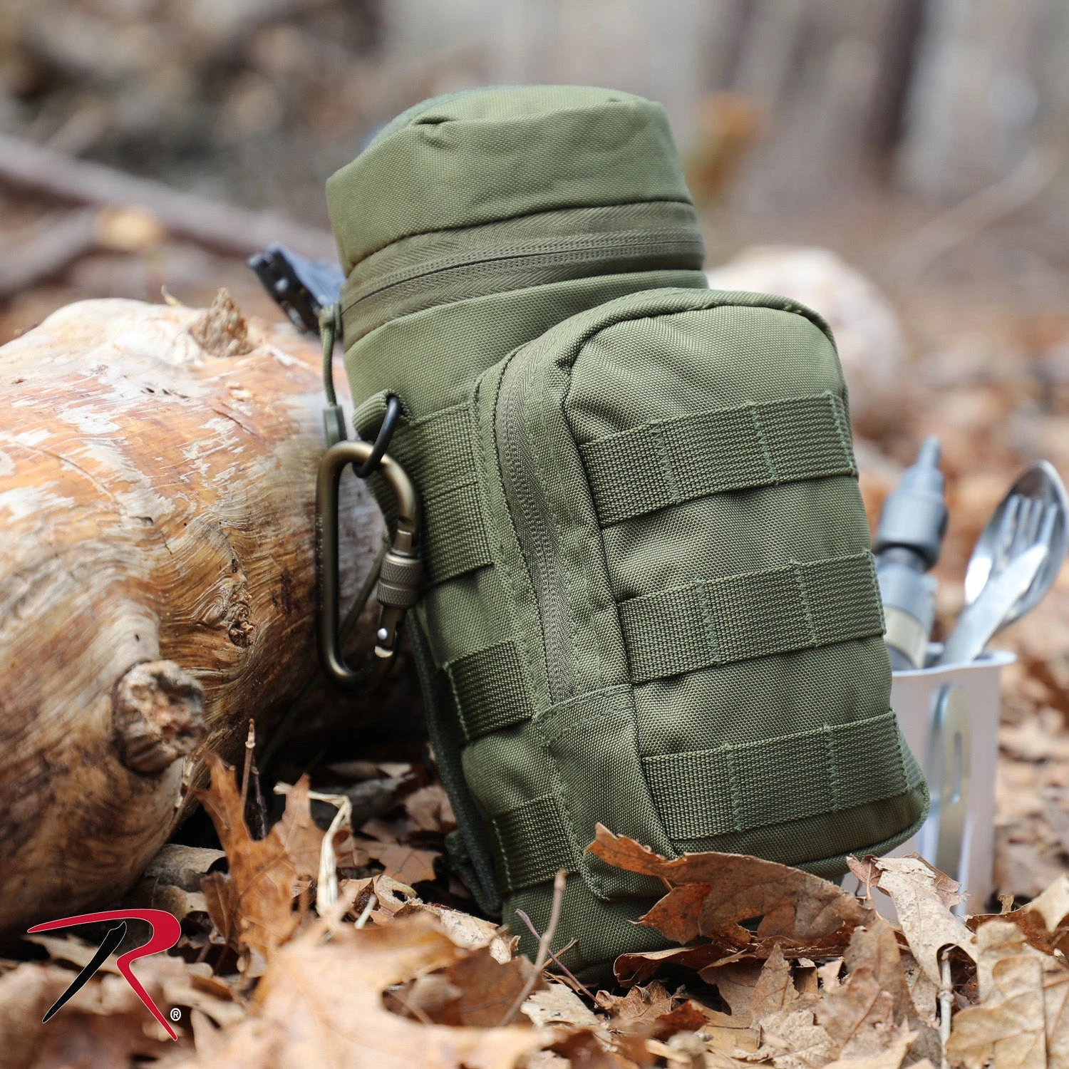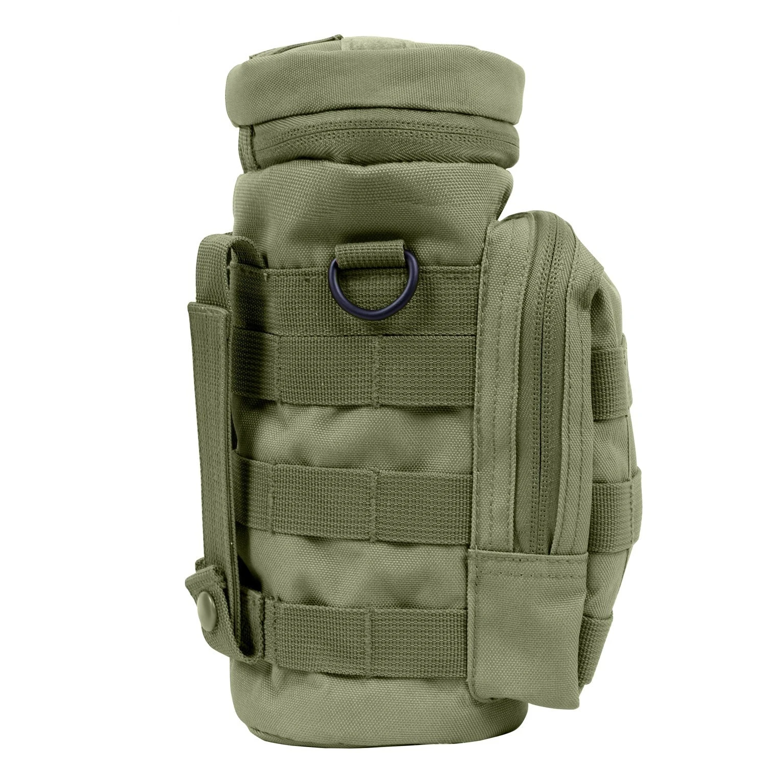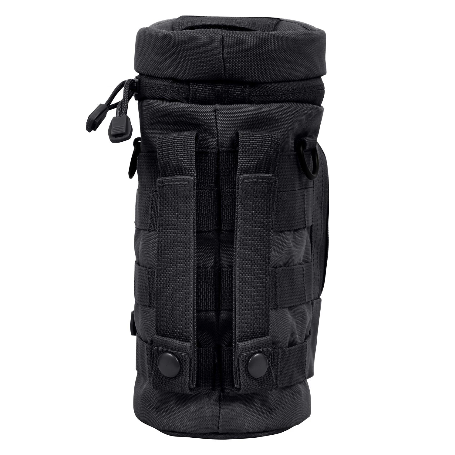 An ideal hydration accessory, this MOLLE compatible water bottle pouch is made of a durable polyester material. The rear pouch will fit most water bottles while the front facing zipper allows you to store additional accessories. Easily connect to your pack using the two 6 inch MOLLE straps on the back. The MOLLE loops around the entire pouch allows provides multiple anchor locations.Â