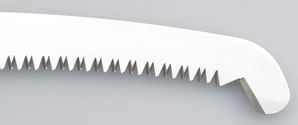 Best-selling, state-of-the-art, professional hand saw with razor-sharp and ultra-fast cutting, mono-constructed, 14-1/5-inch curved blade. The curved blade provides greater cutting speed with less effort. Large and comfortable sure-grip handle gives strength and flexibility to the full length of the saw. The super aggressive tooth pattern is ideal for pruning large limbs. Utilizes proprietary Silky MIRAI-ME (Smooth Cutting) Technology – The Teeth of the Future! The precision-ground, razor-sharp teeth with four cutting angles provide extremely fast, clean and smooth cutting action. Features hard chrome-plated, taper-ground curved blade with non-set tooth design. Taper-ground profile reduces drag and directs more usable energy to the cutting edge. The hard chrome-plated blade has 5.5 teeth per inch, resists rust and effects of tree resin, and wipes clean easily. Superbly designed molded-rubber hand grip encases the blade extension to absorb vibration while cutting. Great combination of high performance blade with a comfortable sure-grip handle that really sticks in your hands. Exceptional design, strength, balance and superior finish quality. Comes with the custom, high-visibility, yellow plastic scabbard that can be attached to the belt or lower leg. Ideal for pruning large limbs on the ground or at height. Made in Japan. SUGOI is available in two blade lengths: 14-1/5-inch (360 mm) and 16-1/2-inch (420 mm).