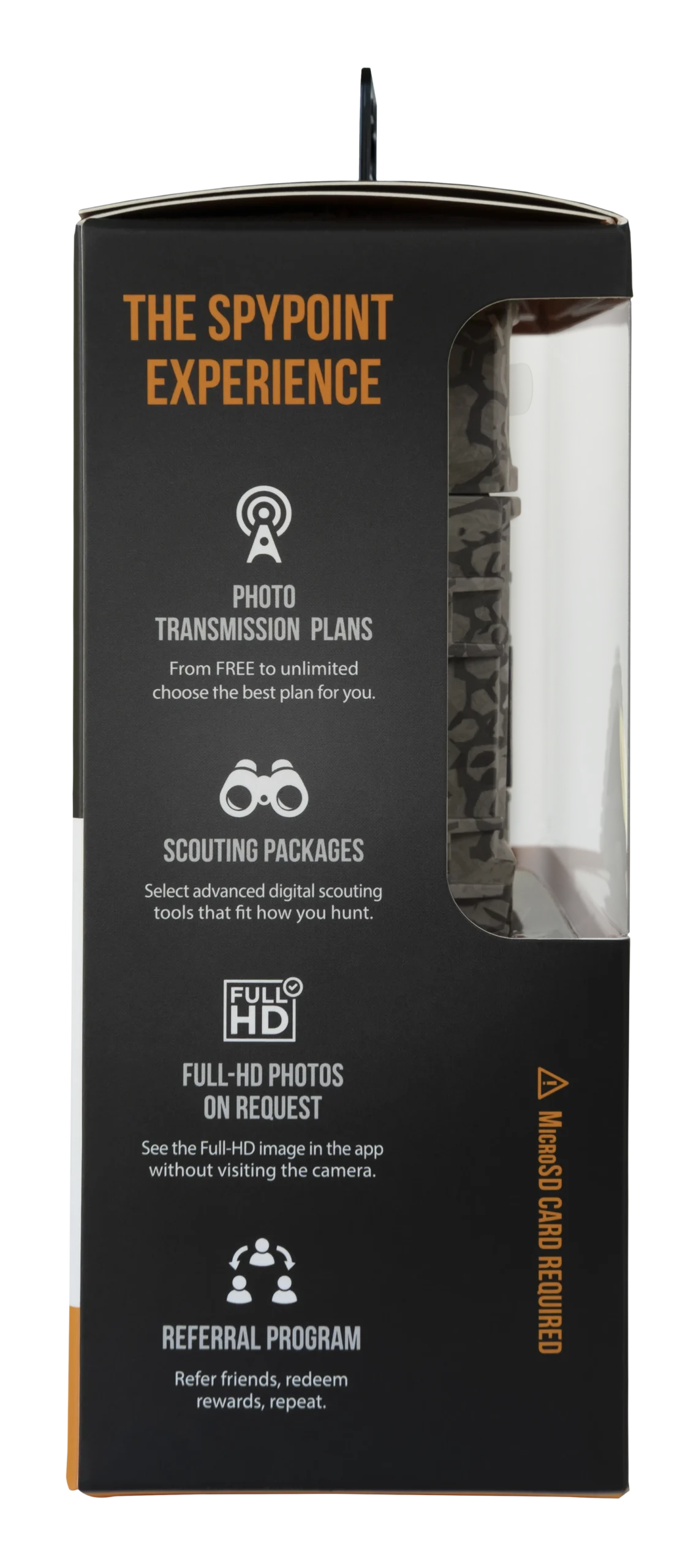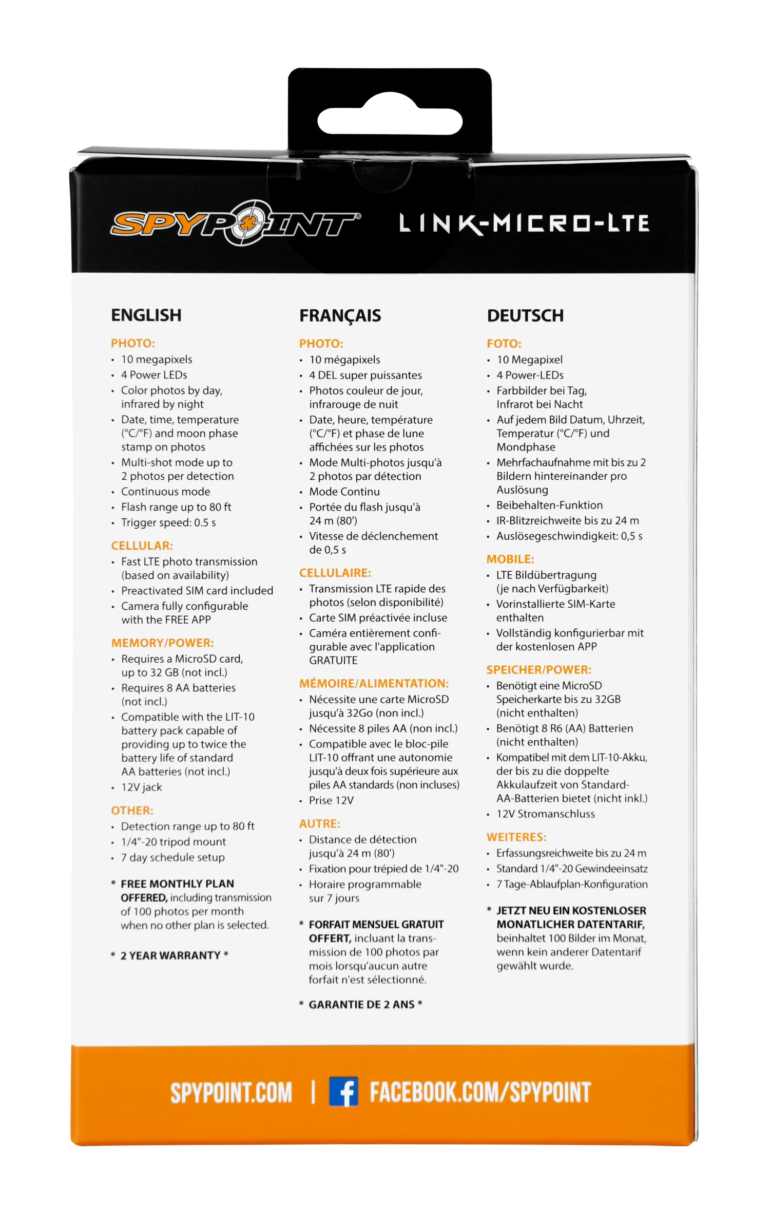 Photos shot with the SPYPOINT Link-Micro-LTE Cellular Trail Camera come in at a 10 megapixel resolution for single shot and multishot photos. This trail camera has both a detection range & a flash range of 80 feet. Paired with the half second trigger speed, you’re guaranteed to take some spectacular long range photos at night.