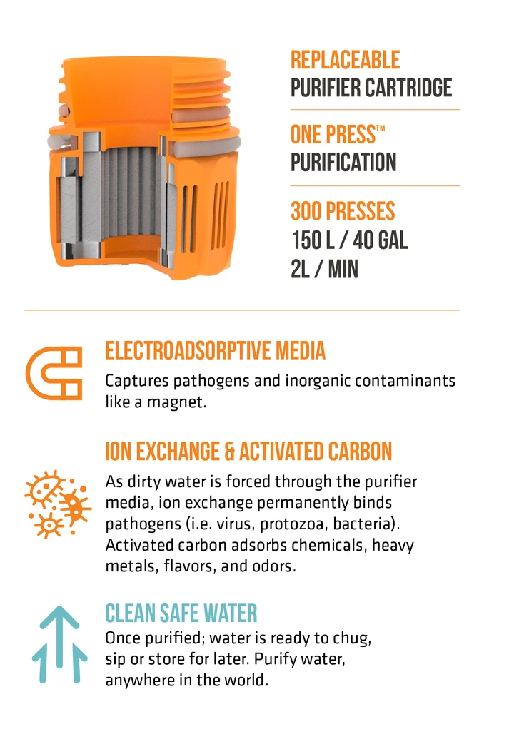 The original purifier that put us on the map. It’s compact, fits in virtually any backpack pocket and provides global protection from waterborne pathogens (VIRUS, bacteria, protozoan cysts), pesticides, chemicals, heavy metals and microplastics. In fifteen seconds, it makes 16 ounces (473 ml) of safe, clean drinking water – anywhere on earth.